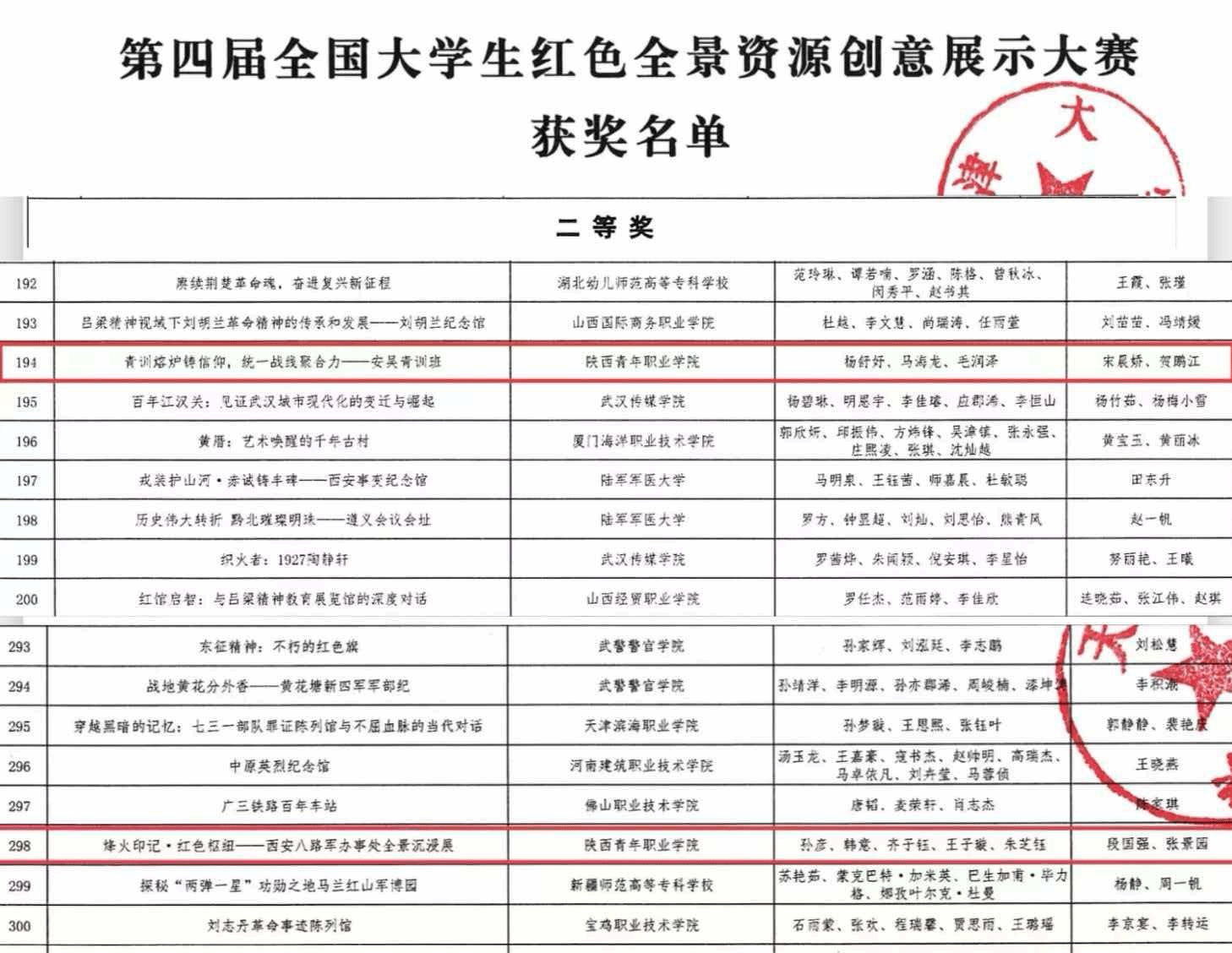 11月5日,第四届全国大学生红色全景资源创意展示大赛成绩揭晓,我校马克思主义学院选送的2部作品从全国31个省(市、自治区)330余所高校提交的1700余件作品中脱颖而出,均荣膺国家级二等奖,获奖等级和作品数量均为近年来参赛的最佳成绩。
