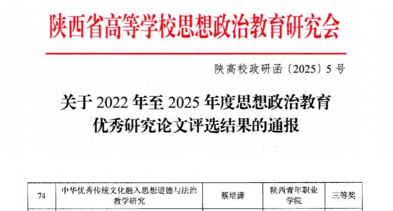 近日,陕西省高等学校思想政治教育研究会公布2022年至2025年度思想政治教育优秀研究论文评选结果,我校马克思主义学院教师蔡培潇撰写的论文《中华优秀传统文化融入思想道德与法治教学研究》荣获三等奖。