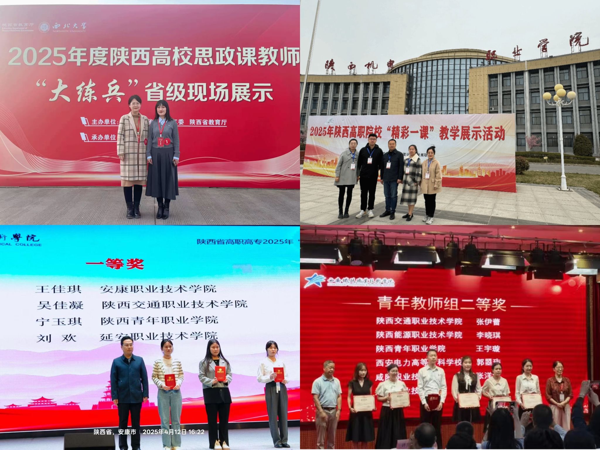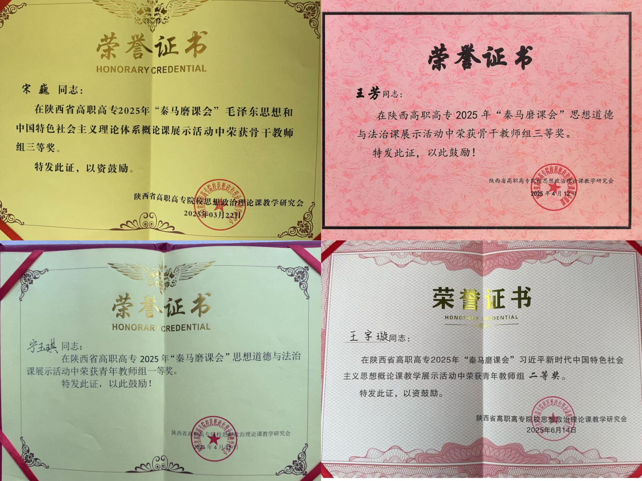 整合"大练兵"与"秦马磨课会"两大品牌赛事,构建"以赛促教、以赛促学、以赛促改"的教师能力提升体系。组建磨课团队,开展专题研讨、模拟授课、互听互评,邀请校外专家专项指导。选派4名教师参加陕西省思政课教师"大练兵"主题活动,2人成功晋级现场展示环节并齐获一等奖;选派6名教师参加陕西省高职院校"秦马磨课会",1人获青年组一等奖、1人获青年组二等奖、2人获骨干组三等奖。1人获陕西高职院校"大思政课"建设联盟"精品课堂"称号。教师团队在省级以上赛事中屡获佳绩,彰显了学院教学实力与创新活力。